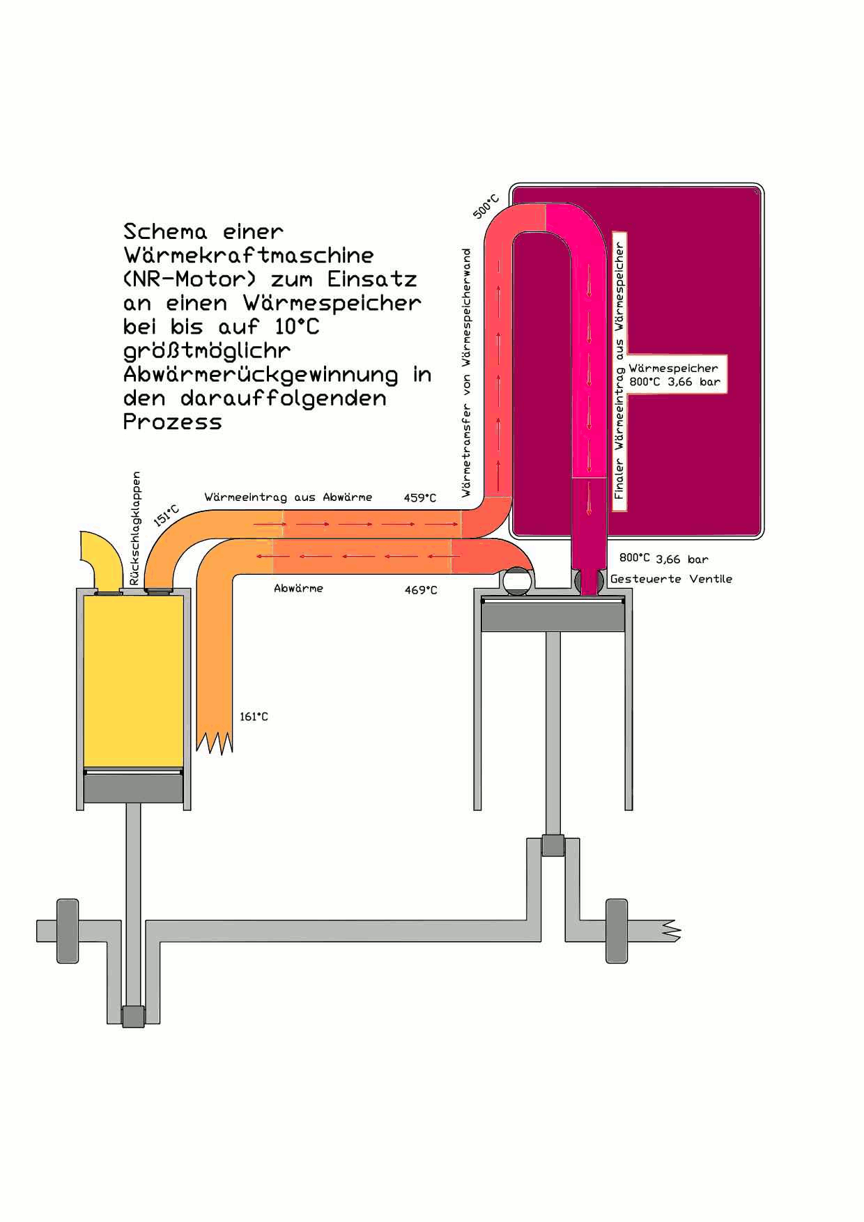 Es finden jeweils zwei Isentrope und zwei Isobare Zustandsänderungen statt. Hierbei ist es möglich eine Isobare Zustandsänderung wegzulassen, da der Prozess bei Luftumgebungsdruck 1 bar beginnt und bei 1 bar, jedoch deutlich höherer Temperatur, endet. Die hohe Temperatur nach Beenden des Prozesses kann im Gegenstromprinzip vergleichbar einer "Kontrollierten Lüftung mit Wärmerückgewinnung" von der Wärmekammer übernommen werden und so den Wirkungsgrad deutlich erhöhen. Ein Grund warum dieser Motor nicht bekannt ist, bzw. bislang nicht gebaut wurde mag in der geringen Leistungsdichte liegen. Hier sind Otto, Diesel oder auch Wankelmotoren deutlich besser und werden somit vorrangig in Fahrzeugen Flugzeugen und anderen Maschinen verbaut. Jedoch hat der NR-Motor im Gegenzug andere Vorteile. So ist der Einsatz für nachwachsende Rohstoffe vergleichsweise unproblematisch möglich. Auch für den Einsatz an Wärmespeichern sollte er bedingt durch die frei gestaltbare und in ihrer Größe nahezu unbegrenzte Wärmekammer deutliche Vorteile haben. An der Entwicklung beteiligt war Prof. Pietsch von der FH Schmalkalden Schema NR - Motor